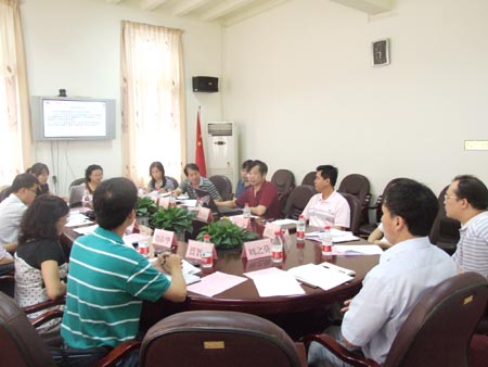 陈学军副校长(右排左四)向检查组汇报项目实施情况及项目成果