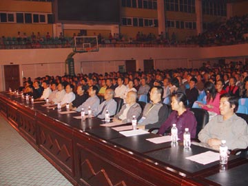 11月8日20:30,由桂林市文化局、桂林市广播电视局和桂林市漓江诗苑主办桂歌飞扬——放歌八桂组合演唱会在桂林工学院体育馆三楼精彩上演。 桂林市人大常委会主任雷熹平,桂林市人大常委会秘书长鲁圣发、桂林市文化局的领导,桂林工学院党委书记黎志逘,桂林工学院院长赵艳林,桂林工学院党委副书记张学洪,桂林工学院办公室、院长办公室副主任耿俊茂和桂林工学院学工处处长熊英、桂林工学院离退休老同志以及各系(院)2000多名学生观看了演出。 8:30,晚会准时开始。由桂林市彩调团伴舞的《南博峰会歌》拉开了本场演唱会的序幕。在接下来的时间里,桂林市曲艺团、桂林市桂剧团和桂林市群艺团相继为观众们带来了精彩纷呈、带有浓郁地方特色的歌舞表演。女生小组唱、男高音独唱、男女二重唱、渔鼓、彩调、天琴弹唱等形式多样的演唱令现场的观众惊叹连连。21:30,演唱会在观众不舍的掌声中圆满落幕! 作为桂林工学院50周年校庆系列表演首场演唱会,本场演唱会的成功举办为之后的迎校庆系列演出奠定了良好的基础,同时,也为即将到来的我院50周年校庆营造了喜庆的气氛。