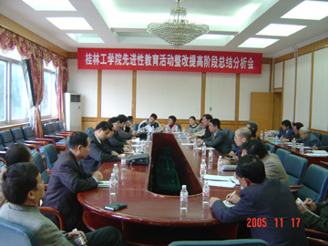 2005年11月17日下午,学院先进性教育活动整改提高阶段总结分析会在教八楼三楼会议室召开。学院院长赵艳林,自治区高校工委保持共产党员先进性教育活动督导三组组长李善辉、成员张月光,学院各党总支(直属支部)书记,先教办主任、副主任,督查组全体成员参加了这次会议。会议首先由赵院长作了题为“围绕发展抓整改,重在落实求实效”的整改提高阶段工作总结报告,接着,与会的同志就赵院长的总结报告、整改工作情况、群众的反映等方面作了认真的分析发言,对学院整改工作取得的实效予以了肯定,最后,督导三组组长李善辉作了讲话,肯定了我院取得的成绩,并对下一步工作提出了具体的意见和要求。