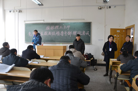 为进一步推进学校干部工作科学化、民主化、制度化,促进优秀人才脱颖而出,切实提高选人用人公信度,根据《桂林理工大学竞争性选拔处级领导干部工作实施办法(试行)》(桂理工党组〔2012〕12号)文件精神,12月30日上午,学校在教九楼举行了竞争性选拔处级领导干部理论考试。来自全校各部门、各单位的近200名现任副处级、正科级干部和任职满三年的副科级干部、学院院长助理、教研室(实验室)主任,具有高级职称或博士学位的专业技术人员参加了竞争性选拔考试。 学校党委书记张学洪,校长解庆林,副校长陈贵英,正厅级调研员张鹏在考试中亲临现场巡视。校领导们此前多次强调,一定要树立围绕发展选人用人的导向,树立凭实绩选人用人的导向,让优秀的人才脱颖而出。同时增强选人用人的公信度,倡导风清气正的用人氛围,在全校树立一种正确的用人导向,倡导学习型干部理念,提高干部队伍素质。 本次竞争性选拔考试,是学校进一步深化干部人事制度改革,不拘一格选拔优秀干部所做的一次积极探索,通过竞争性选拔干部这一方式,拓宽了干部选拔任用的视野,对于从整体上加强干部队伍管理,特别是激发干部队伍活力有重要意义。