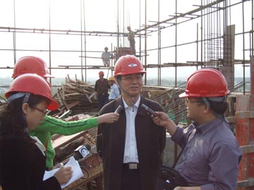 4月24日下午,广西日报、广西电台、广西电视台、人民网广西视窗、桂林日报、桂林晚报、桂林电台和桂林电视台等各大媒体记者到我院雁山校区采访了校区建设情况。记者招待会在雁山校区建设指挥部会议室举行。学院党委书记黎志逘,学院院长赵艳林,学院副院长、雁山校区建设指挥部指挥长肖明贵回答了记者们的提问。在介绍了我院的基本概况、学科专业情况、师资和学生情况、学校发展的总体目标、雁山校区项目建设的必要性、项目建设内容及分期建设计划、项目投资估算及资金筹措和项目投资效益分析之后,赵院长还使用雁山校区鸟瞰效果图向记者们详细介绍了一、二期建设项目的进展情况和三期建设项目的情况。学院党委宣传部部长于海平,党办院办副主任唐壮东,土木系主任、雁山校区建设指挥部副指挥长陈学军,基建处处长、雁山校区建设指挥部副指挥长陈慕杰,基建处副处长、雁山校区工程部主任刘宜河以及基建处副处长唐航星等同志参加了记者招待会。 记者招待会结束后,黎书记、赵院长和肖副院长以及我院与会的其他同志与记者们一起深入施工现场进行实地考察。在施工现场,黎书记和赵院长向施工人员反复强调,一定要保证工程质量。在接受记者们的现场采访中,黎书记和赵院长表示,按照目前的工程进度,我们一定能够保证今年9月1日新生入住雁山校区,5年后,一个环境优美、功能齐全的美丽的桂林工学院新校园一定会展现在广西人民的面前。