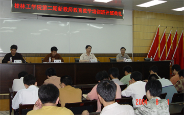 6月1日晚7时,桂林工学院第二期新教师教育教学培训班在学院职工教育培训基地(体育馆附楼501教室)举行了开班典礼,学院副院长周德俭教授,组织部部长、人事处处长赵君同志,教务处处长陈先华同志参加了典礼。 典礼由组织部副部长、人事处副处长莫坷同志主持。学院副院长周德俭教授,组织部部长、人事处处长赵君同志先后讲了话。学院副院长周德俭教授在讲话中指出:一名真正的教师应该具备比较完美的健康的人格、较高的专业素养、科学的方法和手段、无止境的学习追求,这样才能产生言传身教的魅力,实现培养综合素质人才的目的。周副院长希望全体教师能够通过这次培训,努力学习,深刻体会桂工“勤奋、求实、献身、开拓”的八字校风,并将这种精神传授给学生,努力开创桂林工学院教育教学工作新局面。党委组织部部长、人事处处长赵君同志在讲话中强调了本次培训班的任务和目的,对培训班的管理工作和学员的学习作了具体要求。 本期培训采取集中授课、自学、观看录像和讨论相结合的方式进行,聘请了学院教学经验丰富的离退休老教师和在职中青年优秀教师为学员们授课,共开设了“教书与育人”、“怎样当好一名大学教师”、“课堂教学艺术谈”、“当前我院青年教师讲课现况综述”、“优化质量结构、迎接教学评估”、“撰写科研学术论文的方法与技巧”、“高校教师申报科研项目应注意的若干问题”等8个专题讲座,并安排了“从学生到教师的角色转变”、“认真投入、搞好课堂教学”、“教与学的互动”、“参与式教学法的实践”等四部清华大学教学岗位培训录像。培训班还为每位学员印发了收集有52篇优秀论文的《青年教师理论研究与实践》一书作为学习参考资料。 开班典礼结束后,原学院副院长、退休老教师张秋光教授为本期培训班作了第一讲《教书与育人》。