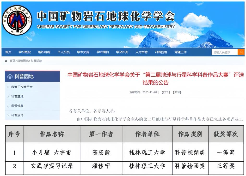 近日,中国矿物岩石地球化学学会发布“第二届地球与行星科学科普作品大赛”评选结果公告,我校师生作品斩获2项荣誉。其中,地质博物馆陈宏毅教授作品《小月壤 大宇宙》荣获科普视频类一等奖,地球科学学院勘查技术与工程2024-1班潘佳宁同学作品《玄武岩实习记录》获科普绘画类三等奖。