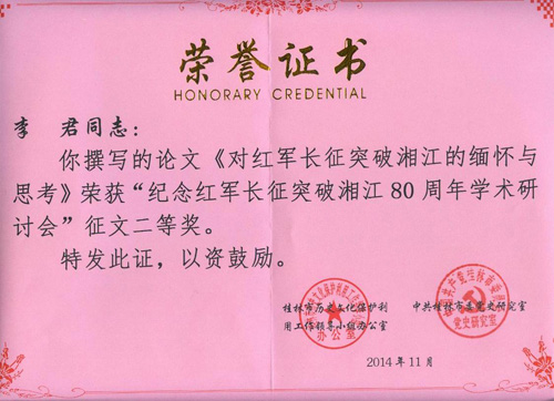 11月24-26日,应中共桂林市委党史研究室的邀请,我校艺术学院李君老师参加了在兴安举办的红军长征湘江战役80周年纪念系列活动。 在25日的纪念活动中,60多位老领导、老红军亲属代表,一起参加了纪念大会、湘江战役纪念馆新馆开馆仪式、电视剧《突围 突围》的看片及红军长征突破湘江80周年学术研讨会,26日前往界首红军堂及光华铺红军烈士墓进行了瞻仰和祭祀。 在纪念大会上,各界群众两千余人观看了“永远跟党走”文艺演出,由兴安中学、桂林市文艺演出公司、红军亲属、于都县长征源合唱团等表演的节目精彩而催人泪下;新建的湘江战役纪念馆展览直观形象、内容丰富、感人至深,是广大群众尤其是广大青少年学习历史、了解长征、继承和发扬革命传统的新的教育基地;电视剧《突围 突围》情节惊险、角度新颖,有望不久在央视一套节目播出。 本次研讨会先期征文,共收到来自全国各地的116篇论文,评选出一等奖3篇,二等奖5篇,三等奖9篇,优秀奖16篇,组织奖3名。李君老师的《对红军长征突破湘江的缅怀与思考》获得二等奖,我校退休教师周述忠老师的《红军长征过桂林及其对实现中国梦的启示》获得优秀奖。研讨会上,红军亲属和各级领导为获奖作者颁发了荣誉证书。 活动期间,李君老师将近几年来创作的艺术作品《红军走过的路》(宁林作曲)、《老山界放歌》、《那条江,那座山》、《西行英雄》等送给肖华将军(《长征组歌》的词作者)、李天佑将军(广西临桂人)、杨成武将军、韩伟将军等的亲属,以表达对红军长征和革命先烈的敬仰和缅怀。 “长征是宣言书,长征是宣传队,长征是播种机”,红军长征过桂北为这片土地留下了长征精神和长征文化,这也是桂林文化的重要组成部分,我校教师积极参加研讨,体现了我校对桂林文化研究的自觉和使命,也将促进我校红色教育的开展。