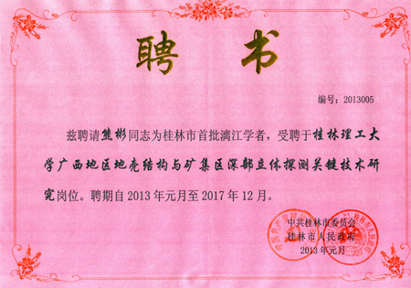 2013年1月14日上午,市委、市政府举行桂林市首批“漓江学者”聘任仪式,正式聘任5名专家为桂林首批漓江学者。市委书记、市人大常委会主任刘君,市长李志刚分别为5名漓江学者颁发聘书。我校地球科学学院熊彬教授光荣入选,受聘为我校“广西地区地壳结构与矿集区深部立体探测关键技术研究”岗位漓江学者。我校陈贵英副校长参加了会议。 桂林市首批“漓江学者”共有5名,是从报名的20多名国内外专家、学者中经专家评审答辩、市委人才工作协调小组会议和市委组织部部务会讨论、市委研究审定、拟聘任公示等招聘程序选拔出来的。 熊彬教授,生于1974年,湖北仙桃人,中共党员,博士,教授,博士生导师。熊彬教授作为自治区重点学科“地球探测与信息技术”的学术带头人,主要从事电磁地球物理理论与方法、电磁法数值模拟及反演成像等方面的教学及科研工作。曾先后主持国家高技术研究发展计划(863计划)、国家自然科学基金项目、教育部博士点基金新教师项目、省(自治区)自然科学基金项目、中国地质调查局地质调查工作项目的研究。在《地球物理学报》、《地球科学》、《吉林大学学报》、《中南大学学报》、《地球物理学进展》、《International Journal of Geophysics》、《Journal of Geophysics and Engineering》等国内外学术刊物上合作公开发表学术论文或会议论文60余篇。曾荣获湖南省第十一届、十二届“自然科学优秀论文一等奖”、湖南“何继善基金青年科技奖”、“广西科学技术进步奖二等奖”、“中国地球物理学会科学技术进步奖三等奖”、“广西自然科学奖三等奖”,2010年入选“广西高校优秀人才资助计划”,享受桂林理工大学拔尖人才特殊津贴。熊彬教授兼任第二届地球电磁专业委员会常务委员会委员、广西地球物理学会第三届理事会常务理事、广西地质学会第八届理事会副秘书长。 熊彬教授获聘为漓江学者,是桂林市委、市政府对其学识、能力、业绩和品行的充分肯定与高度认可,同时也是对其引领和服务桂林经济发展的信任与期望,是我校的光荣。我们期望熊彬教授争做自主创新的先锋,力推科学研究、技术创新、产业发展相结合,大力培养青年人才,建设一流创新团队,为学校的学科建设与发展做出卓越的贡献。