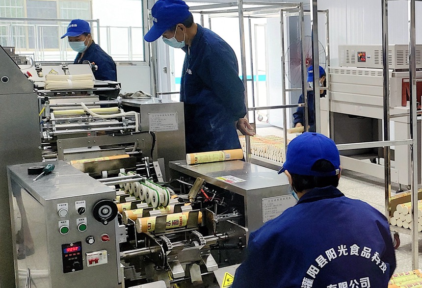 乡村要振兴,产业要先行。黄关面条不仅是当地村民一个主要经济来源,更是灌阳人祖辈的乡土记忆。然而,黄关镇周边村庄的小作坊生产模式,存在生产不成规模、卫生条件差、经营理念落后、品牌价值度低等问题,已不能适应新时期市场需求。在上级乡村振兴扶持资金和后援帮扶单位桂林理工大学的资金与研发技术加持下,在村委院子里建成了占地面积1200多平方米的黄关面条厂,年产量可达1000吨,使黄关面条走上了标准化、规范化、品牌化道路,成为集生产、加工、销售于一体的村集体企业——灌阳县阳光食品科技有限公司。