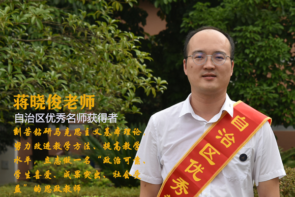 蒋晓俊,我校马克思主义学院副院长。作为一名思想政治理论课的专任教师,他始终坚持刻苦钻研马克思主义基本理论,努力改进教学方法、提高教学水平,立志做一名“政治可靠、学生喜爱、成果突出、社会受益”的思政教师。近5年来,蒋老师在教学方面所授课程的学生评价等级均为优秀,连续4年获得学校年度优秀工作者,获得自治区级教学竞赛二等奖2次,三等奖1次。