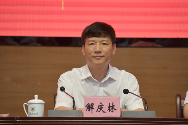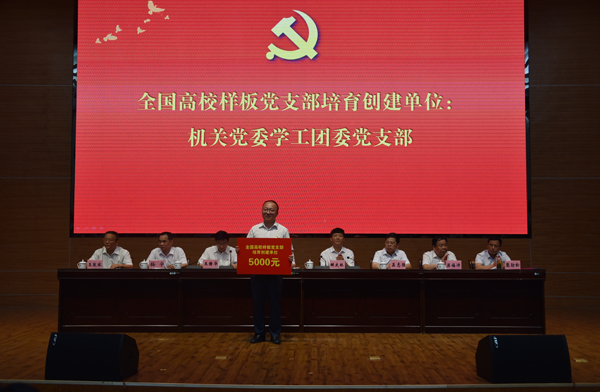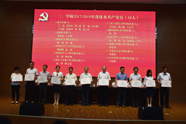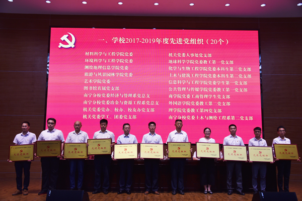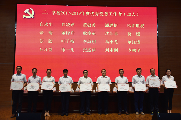 学校党委副书记、校长解庆林同志宣读关于表彰全国高校样板党支部培育创建单位文件,宣读学校2017-2019年度先进党组织、优秀共产党员、优秀党务工作者的表彰决定。全国高校样板党支部培育创建单位——机关党委学工团委支部、学校20个先进党组织代表、50名优秀共产党员代表、20名优秀党务工作者代表等依次上台接受表彰。