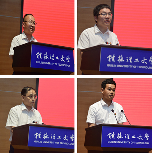 全国高校样板党支部培育创建单位、机关党委学工团委党支部书记张成龙同志,优秀共产党员代表、材料科学与工程学院党委教工第二党支部“双带头人”党支部书记张瑞同志,优秀党务工作者代表、商学院党委房产教工党支部“双带头人”党支部书记马小龙同志,学校派驻贫困村党组织第一书记代表、灌阳县黄关镇顺溪村第一书记边晓杰同志,依次代表单位或个人发言,谈了建设壮美广西、推进学校各项事业发展的心得和体会。