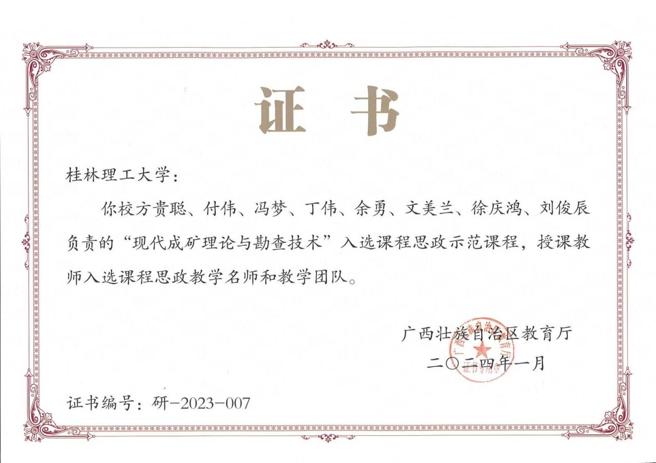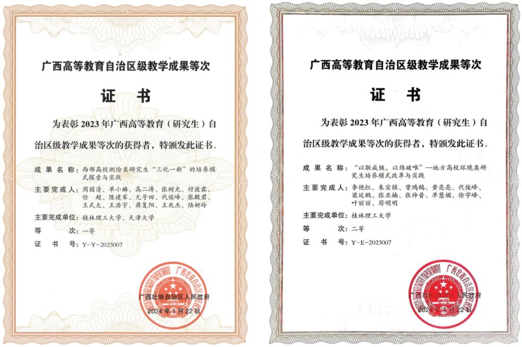 研究生课程建设亮点突出。2023年,研究生课程《现代成矿理论与勘查技术》获评自治区级课程思政示范课程,其负责人及团队获自治区级课程思政教学名师和团队认定,研究生公共管理研究教学团队被认定为自治区级课程思政示范基层教学组织。研究生联合培养基地提质扩面。与66家单位建立合作,建成23个区级、91个校级研究生联合培养基地;2023年,3个基地入选第一批广西示范性研究生联合培养基地。研究生教学成果等次实现新突破。我校作为第一完成单位,斩获自治区级研究生教学成果一等、二等等次各1项。研究生学科竞赛成果丰硕。五年来,学生获学科竞赛国家级一等奖60余项、二等奖150余项、三等奖220余项,省部级特等奖80余项、一等奖580余项、二等奖900余项、三等奖1100余项。
