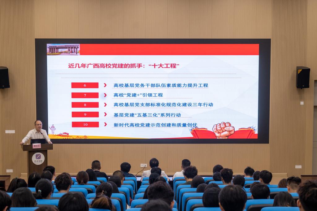 一是抓实党的政治建设。制订《抓落实十条措施》,设立党政联席会督办“压轴议题”,常态化跟踪问效,贯彻各项决策部署更加坚决,拥护“两个确立”更加自觉,做到“两个维护”更加坚定。二是持续强化思想武装。扎实开展各项主题教育,坚持和完善第一议题学习和教职工定期政治理论学习制度,举办党的二十大、党的二十届三中全会和全国教育大会精神等专题辅导,学思践悟党的创新理论更加深入。三是加强思想政治引领。守正创新打造特色品牌,体系化谋划思政工作,组织开展“解放思想出新‘艺’·创新求变建新‘术’”系列大讨论活动,创办“艺周思享绘”、“宿舍周周谈”,思想引领更加有力,教师先后荣获广西高校辅导员职业素质能力大赛特等奖等一批奖项,学院获批广西“三全育人”示范院系。