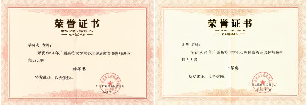 我校教师在2024年广西高校大学生心理健康教育课教师教学能力大赛获特等奖1项、一等奖1项