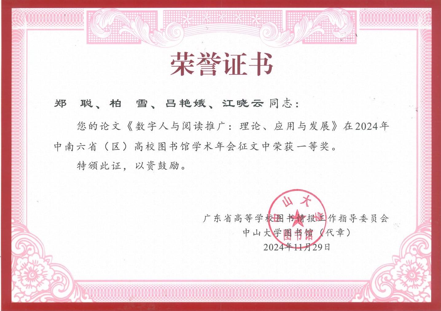 图书馆教师团队论文在中南六省(区)高校图书馆学术年会征文中荣获一等奖