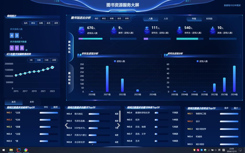 聚焦智慧图书馆建设,持续推进“一体化”服务体系,实现资源与读者数据“一屏统揽”,为科学决策提供有力支撑。建成智慧阅读空间,优化信息化设施设备布局,稳步推进服务器虚拟化,提升系统稳定性与响应效率。完成图书馆门户网站升级,建成屏风馆读者信息素养教育培训室,打造雁山馆教师研学专区,持续拓展智慧服务场景。